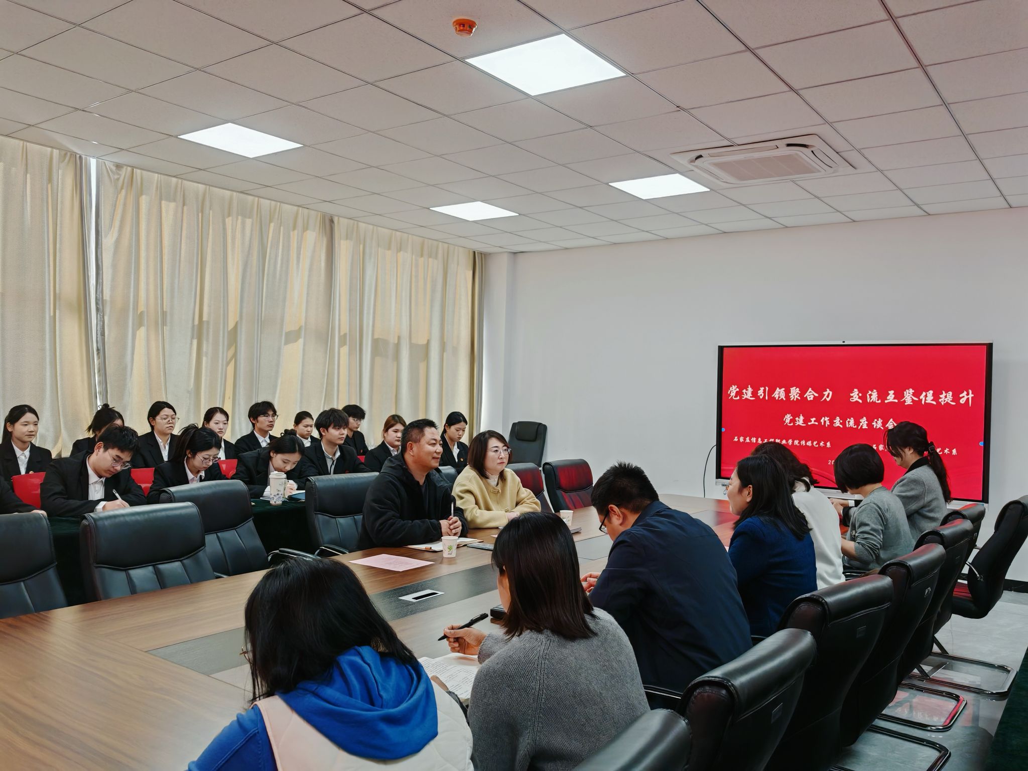 为深化党建工作创新、赋能省级标杆院系建设。2025年11月25日,传媒艺术系邀请全国党建样板支部---石家庄职业技术学院艺术设计系教师党支部书记梁媛,该系党总支书记李艳良莅临指导,围绕党建品牌建设、党建与业务融合路径等议题展开深入探讨。传媒艺术系党总书记张婷、主任袁立敏、副书记刘旭出席会议,各支部党员代表,学生党员和学生入党积极分子代表共同参会。