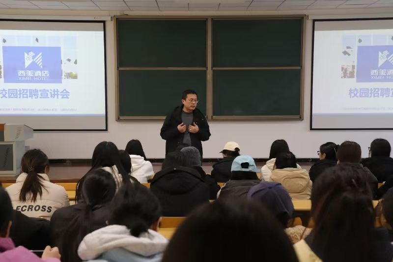 11月28日下午,管理系邀请石家庄西美商务酒店有限公司、石家庄市西美五洲酒店有限公司、石家庄市西美金五洲酒店有限公司和桥西区西美喜家酒店4家知名酒店在知新2号楼310教室召开招聘宣讲会,2025届酒店管理与数字化运营专业和旅游管理专业毕业生到会聆听。