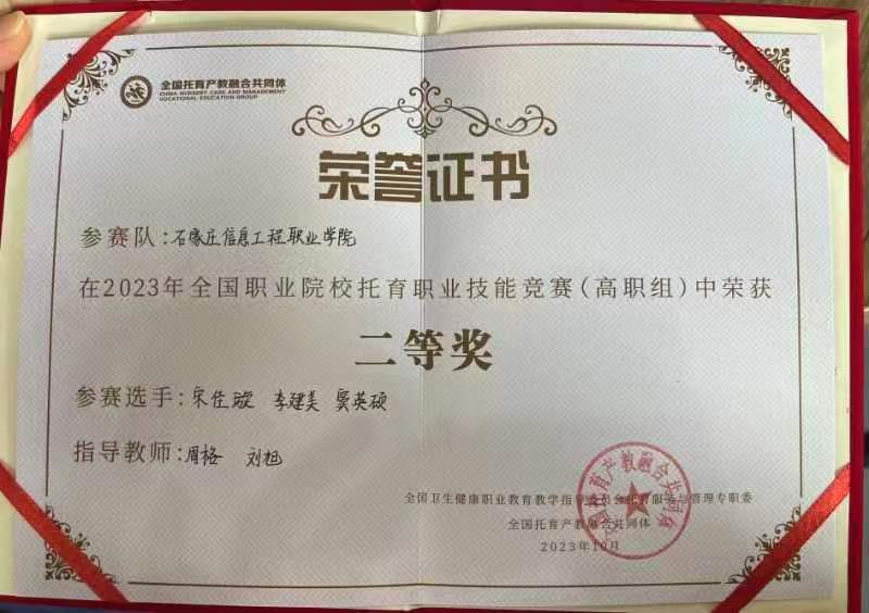 10月28日,由全国卫生健康行指委托育服务与管理专指委指导,全国托育产教融合共同体主办的第一届全国职业院校托育职业技能竞赛(高职组)在宁波幼儿师范高等专科学校落下帷幕。我校管理系婴幼儿托育服务与管理专业宋佳璇、李建美、窦英硕三名同学组成的代表队在周格、刘旭两位老师的指导下,荣获团体二等奖的好成绩。