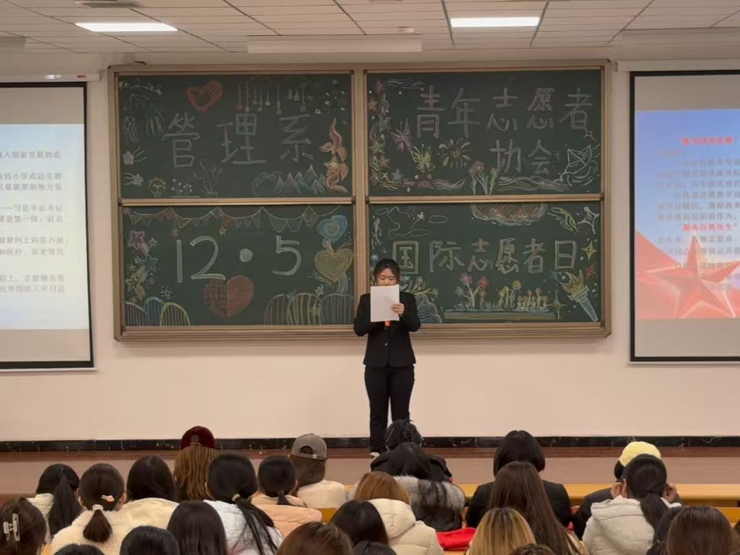 12月5日,在第三十八个国际志愿者日来临之际,管理系青年志愿者协会隆重举办了“青春志愿行,奉献新时代”主题教育活动。活动旨在弘扬“奉献、友爱、互助、进步”的志愿精神,深入学习领会习近平总书记对志愿者群体的关怀与指示精神。