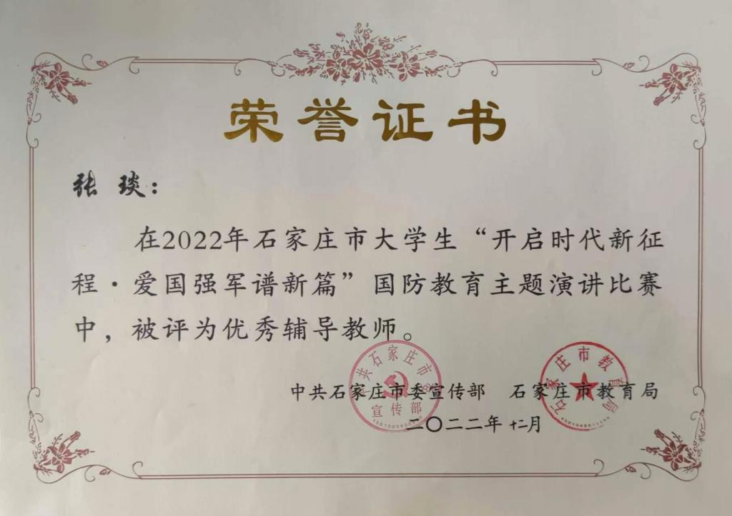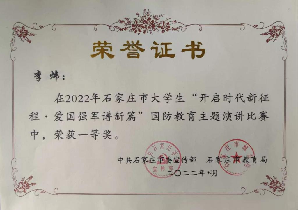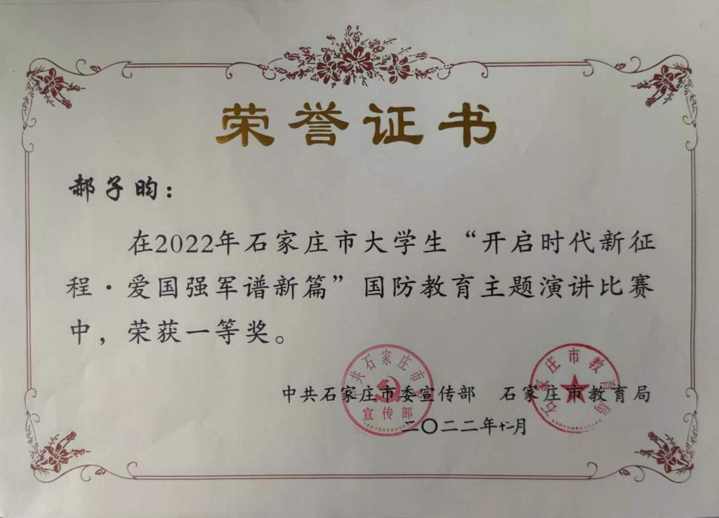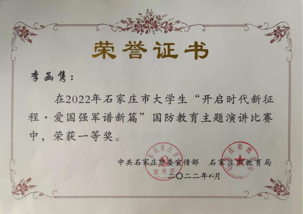 2022年10月,石家庄市委宣传部、石家庄市教育局在全市高校范围内开展了“复兴强国有我”2022年石家庄市大学生“开启时代新征程·爱国强军谱新篇”国防教育主题演讲比赛,我院团委经过层层筛选,组织了四名学生参赛。比赛结果喜人,参赛的四名同学2021级管理系旅游管理3班孙泽宇、2021级网络与通信工程系现代通信1班李炜、2021级计算机应用系人工智能技术应用2班李函隽、2021级管理系旅游管理2班郝子昀全部荣获一等奖,张琰老师荣获“优秀辅导教师”。