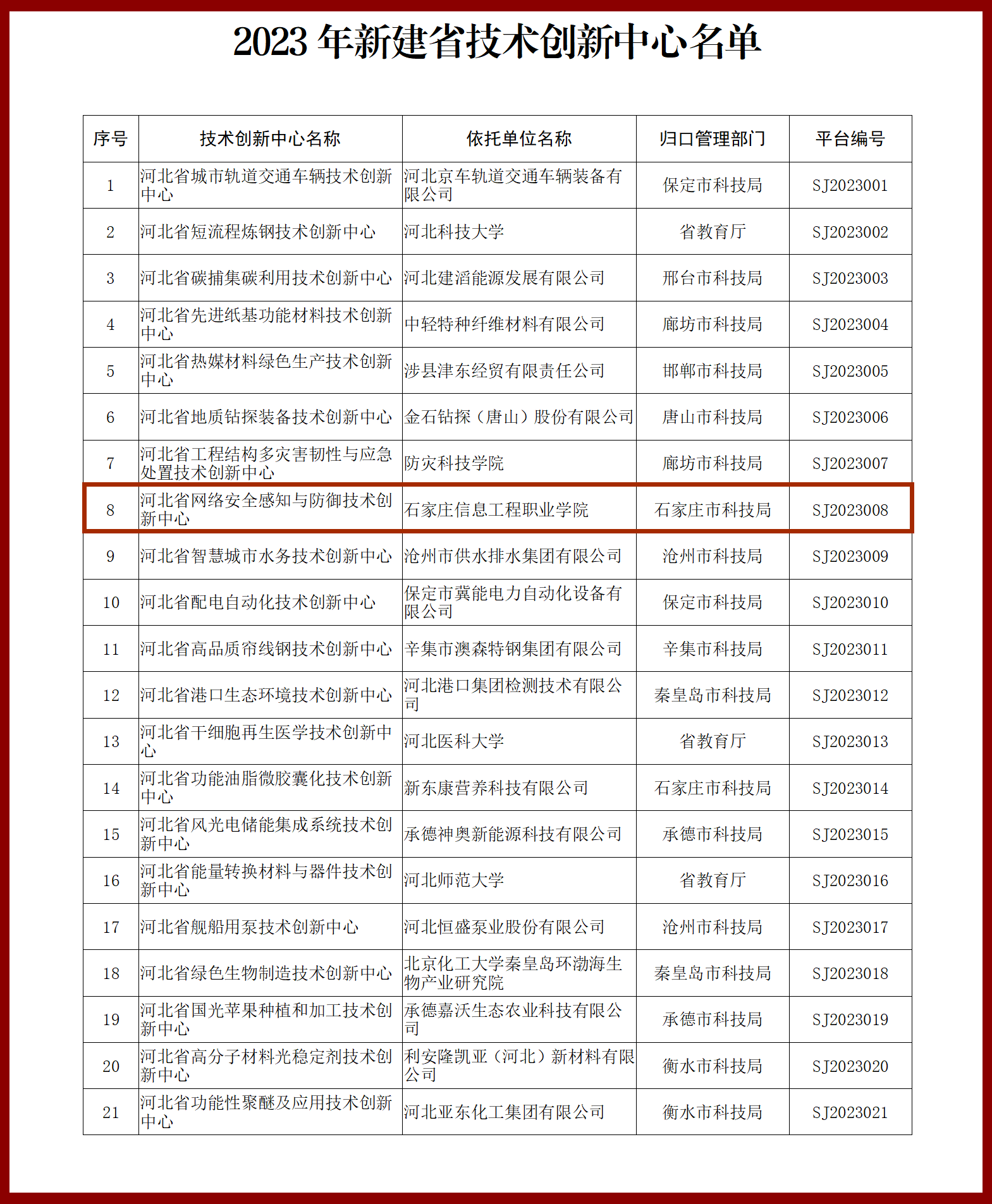 近日,河北省科技厅发布了《关于公布2023年新建省技术创新中心名单的通知》,公布了2023年新建省技术创新中心名单,我院“河北省网络安全感知与防御技术创新中心”顺利通过审批,纳入省级研发平台建设序列。