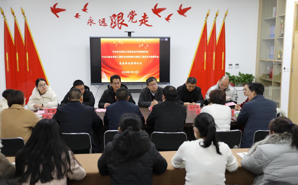 为实现以党建促共建,以共建促合作,以合作促发展,1月15日上午,网络与通信工程系在知行楼108党员活动室与河北师范大学职业技术学院举行党建联建授牌仪式。学院副院长赵伟,党委委员、组宣部部长范成宝与河北师范大学职业技术学院党委书记寇国栋,院长、副书记兼河北省职教所所长靳慧龙出席活动。