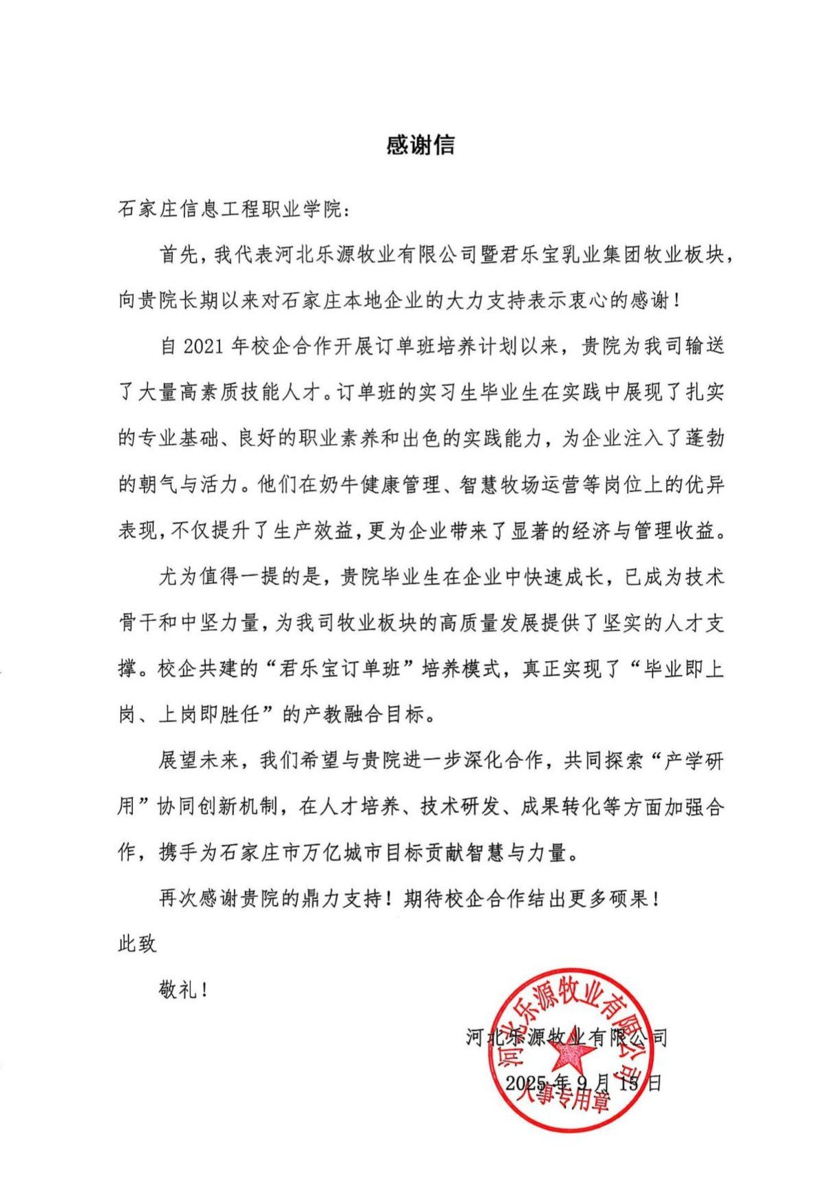 校企合作结硕果,产教融合谱新篇。近日,我院收到河北乐源牧业有限公司(君乐宝乳业集团牧业板块)发来的感谢信,信中充分肯定校企合作订单班的人才培养质量,并对学校长期以来对本地企业的支持表示衷心感谢。