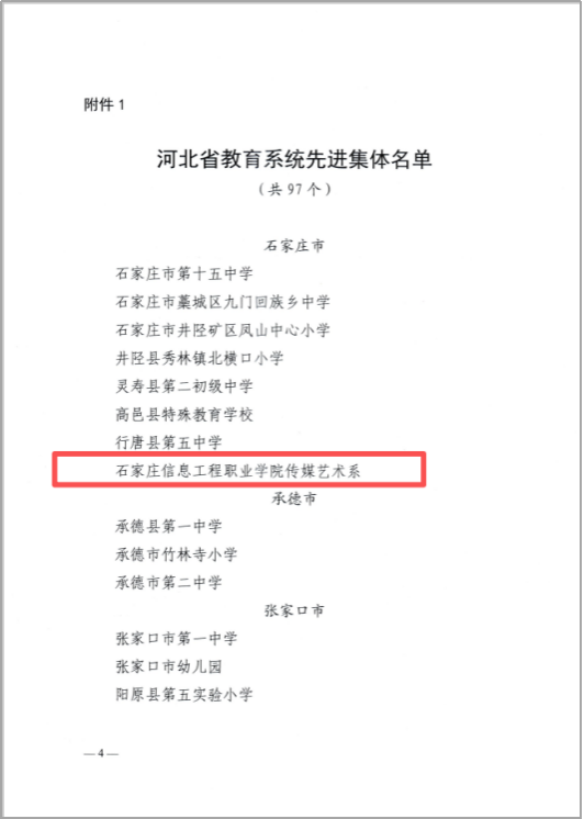 传媒报佳讯,喜报展风采。近日,由河北省人力资源和社会保障厅、中共河北省委教育工作委员会、河北省教育厅联合发文表彰,我院传媒艺术系高质量党建、教育教学改革、人才培养、学科建设及社会服务等突出表现,荣获“河北省教育系统先进集体”称号。