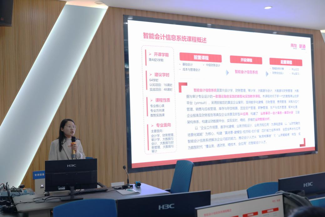 新道科技三位教研专家依托用友YonBIP商业创新平台,通过真实企业案例,分别围绕《智能会计信息系统》《低代码创新应用基础》《财务智能体应用与构建》三门核心课程,开展课程设计、岗位面向、教学实施及实操演示等全维度分享,全方位呈现数智化课程建设与教学的实操路径,为新专业核心课程资源建设积累了宝贵实践经验。