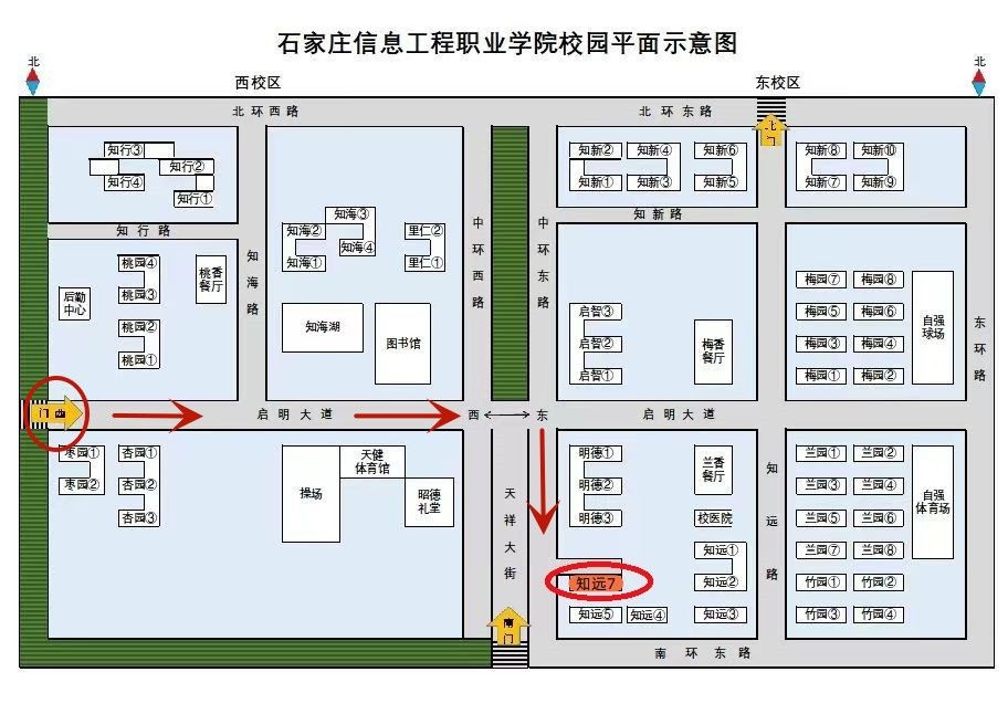 1.考场位置:石家庄市藁城区天祥大街81号东校区知远7号楼4楼(如下图所示)。