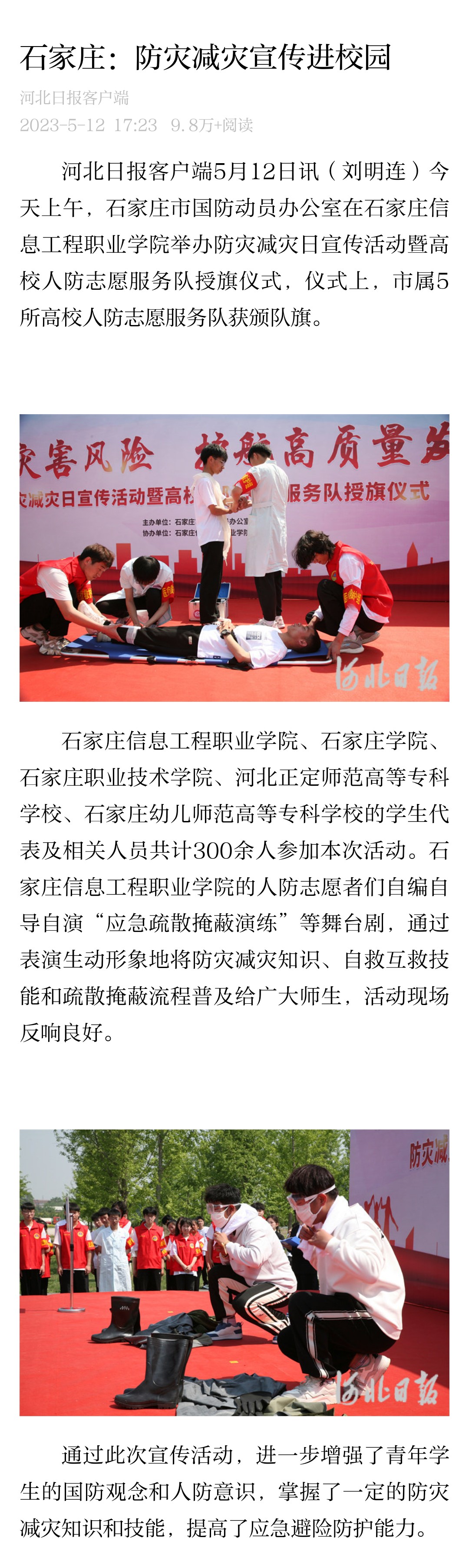 今天上午,石家庄市国防动员办公室在石家庄信息工程职业学院举办防灾减灾日宣传活动暨高校人防志愿服务队授旗仪式,仪式上,市属5所高校人防志愿服务队获颁队旗。