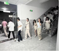 当晚7时整,随着消防应急广播在宿舍楼响起,演练正式拉开帷幕。各楼层志愿者立即到位,引导同学们用湿毛巾或袖口捂住口鼻,按照预定方案,沿宿舍楼两侧楼梯快速有序撤离。疏散过程中,同学们沉着冷静,在志愿者“注意脚下、保持间距”的提醒下,有效避免了在门口、楼梯口等区域发生拥挤。待所有学生撤离后,志愿者们最后进行清查并有序撤出。也按照规划的路线有序撤离。