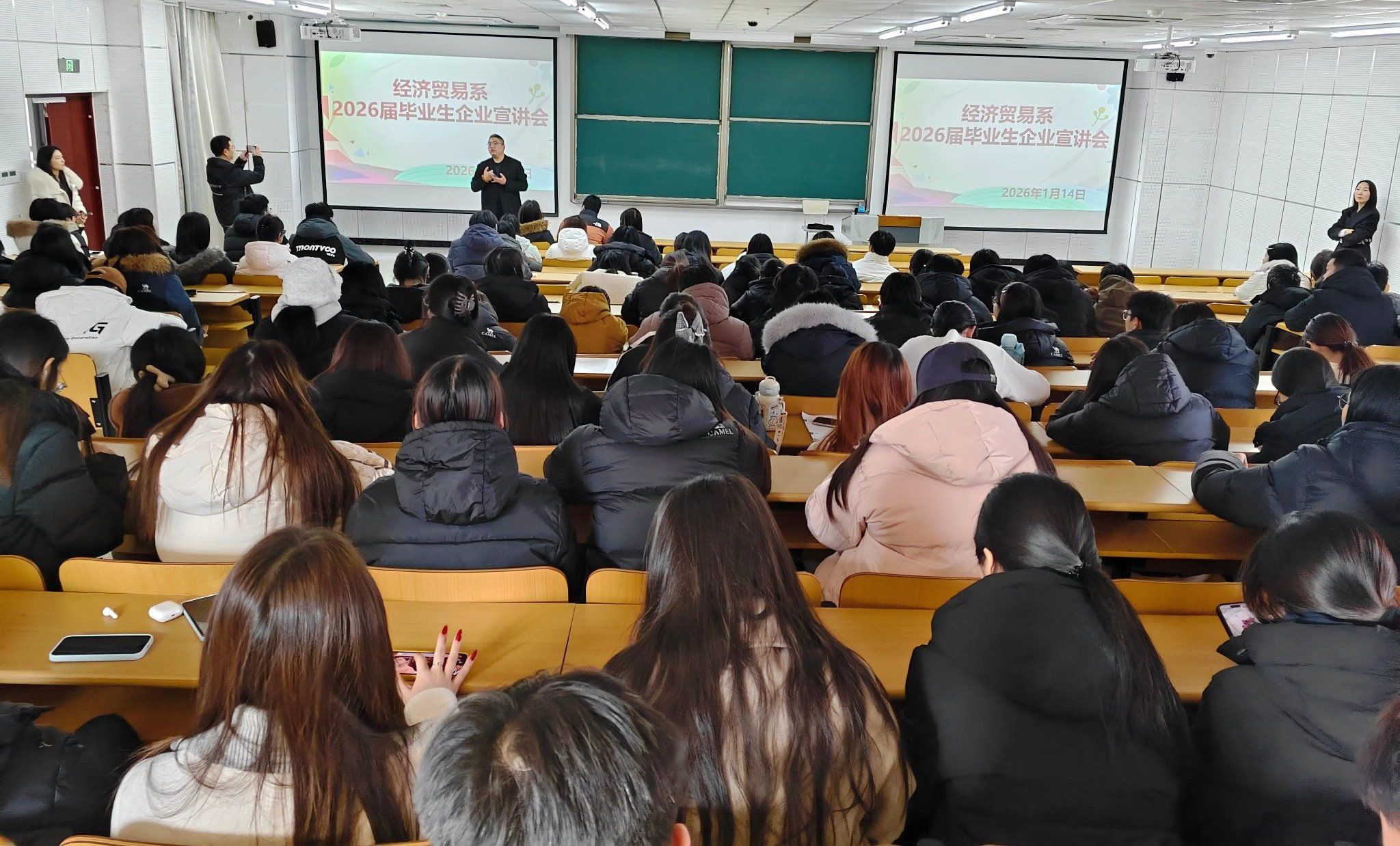 1月14日下午,经济贸易系与招生就业指导中心联合举办了2026届毕业生专场宣讲会。本次活动共邀请石家庄燃雨康禾生物科技有限公司、北京中渲物流有限公司等六家省内外优质企业进校,面向经济贸易系下设的现代物流管理、跨境电子商务、市场营销、电子商务四个专业毕业生,开展了深入精准的岗位推介与人才对接。