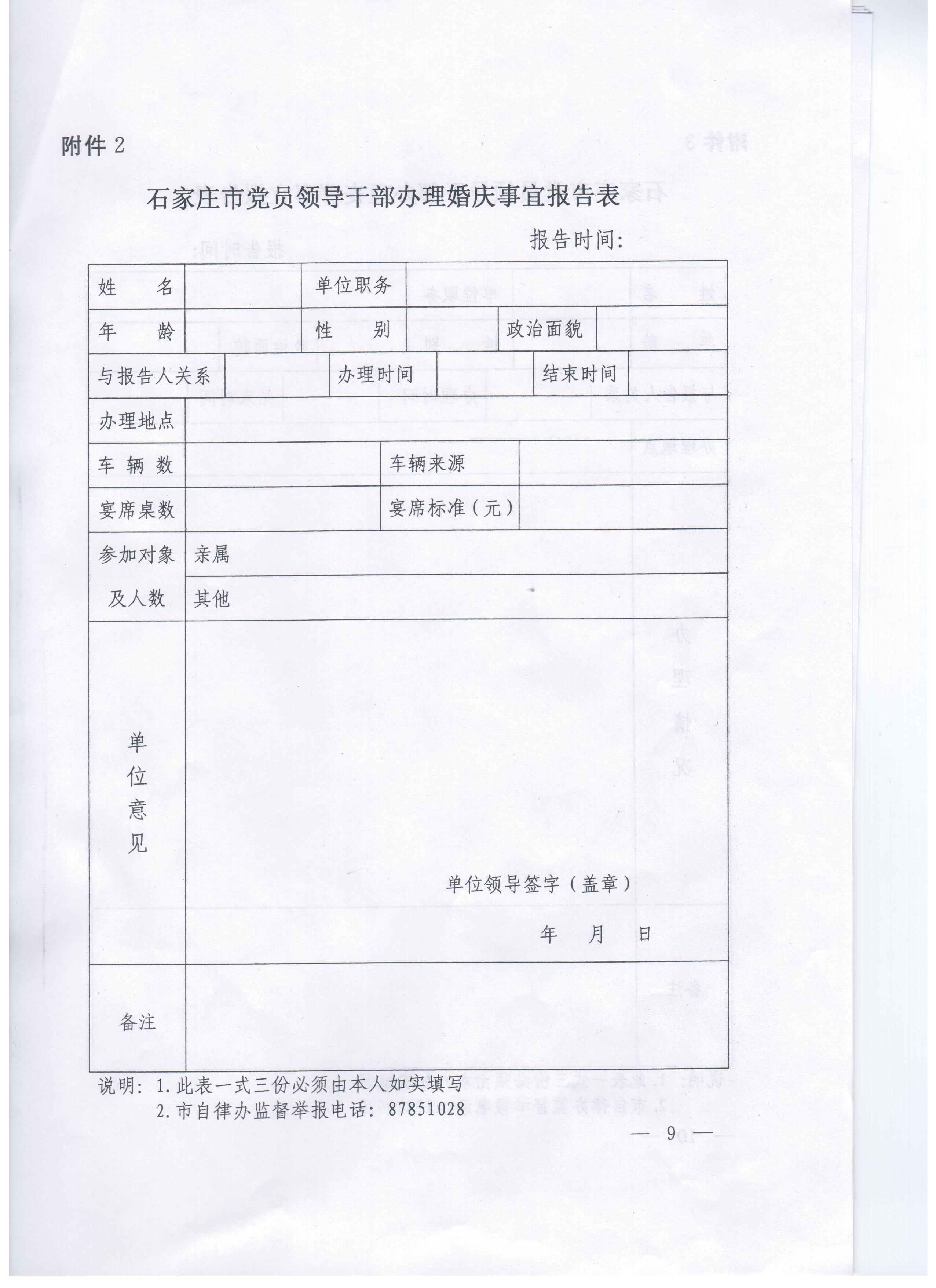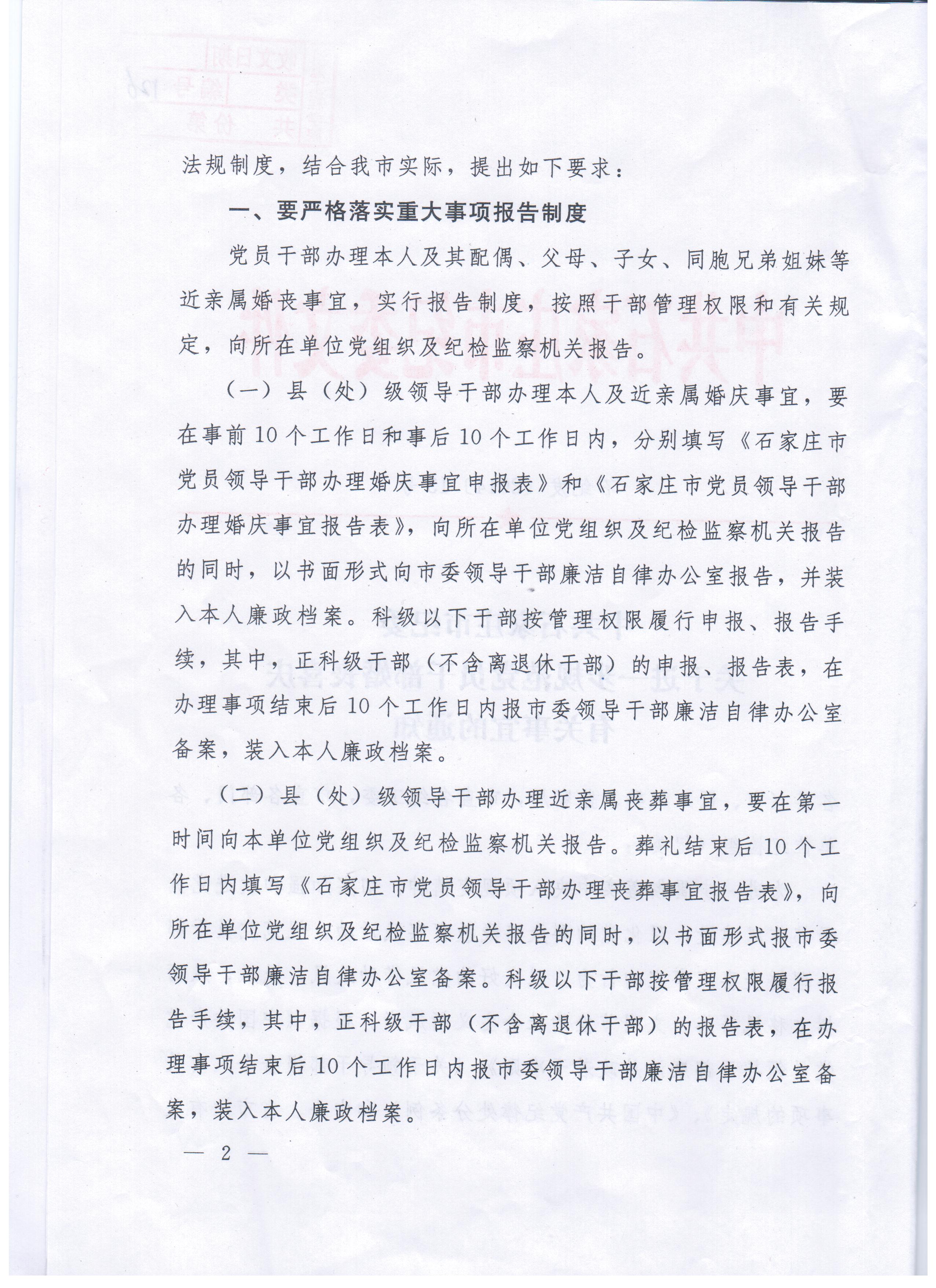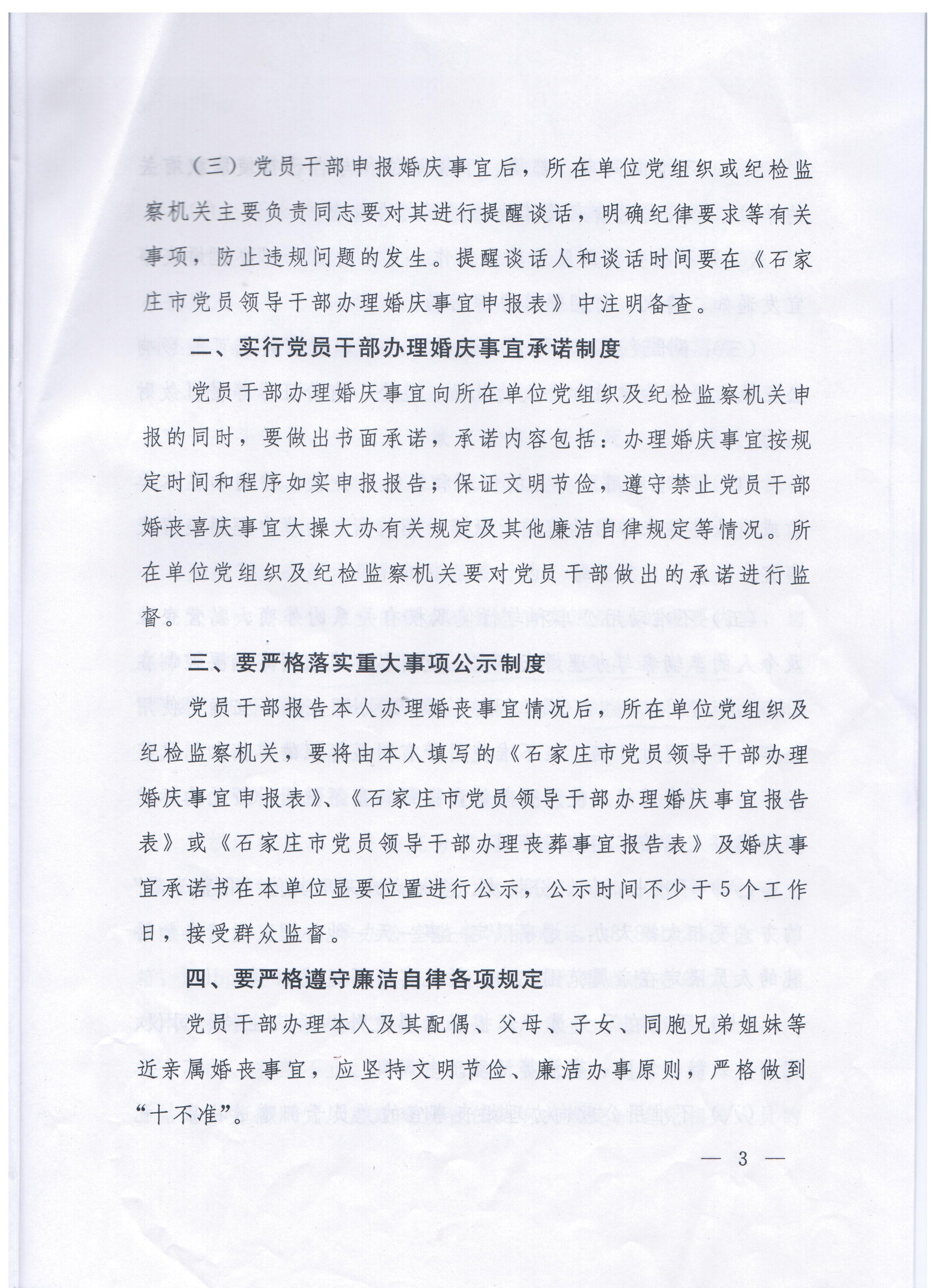 现将中共石家庄市纪委《关于进一步规范党员干部婚丧喜庆有关事宜的通知》转发给你们,迅速组织本部门所有人员认真学习,贯彻落实,严格遵守。