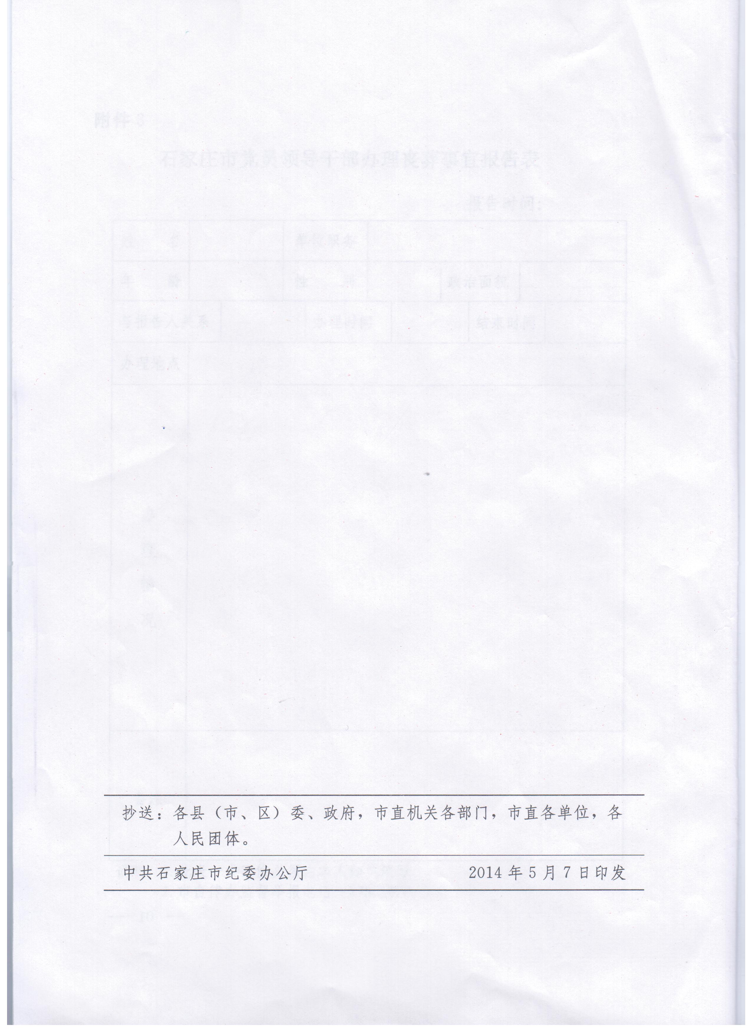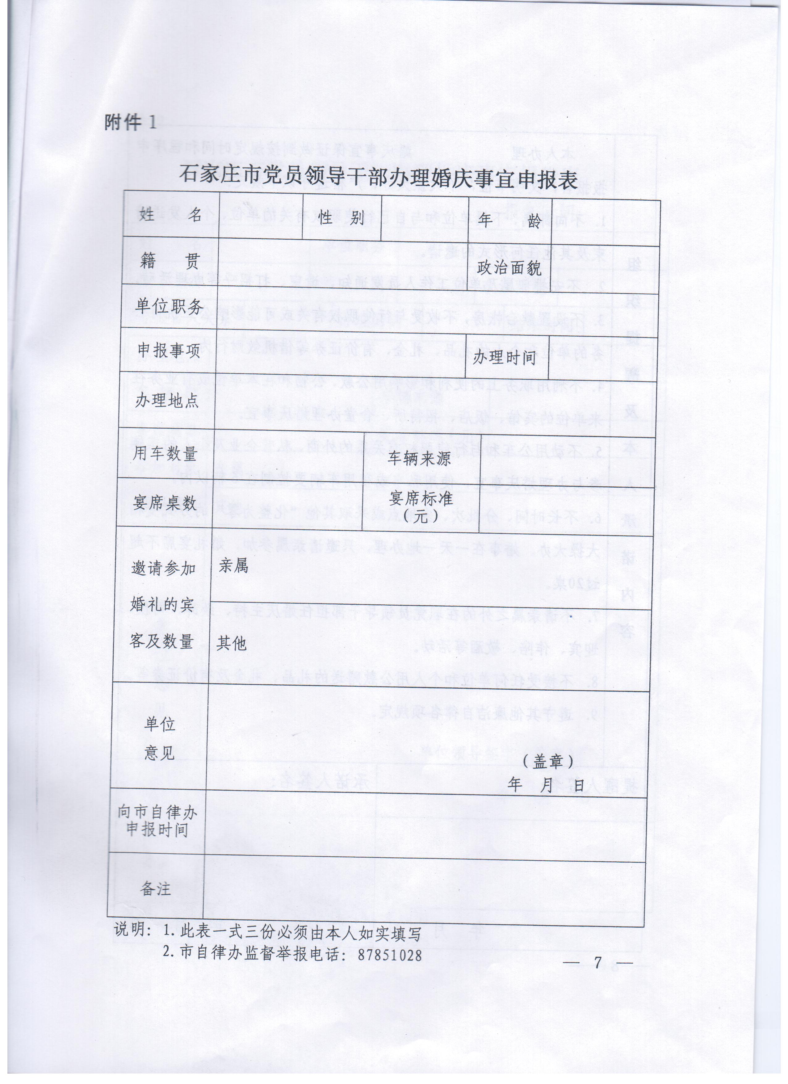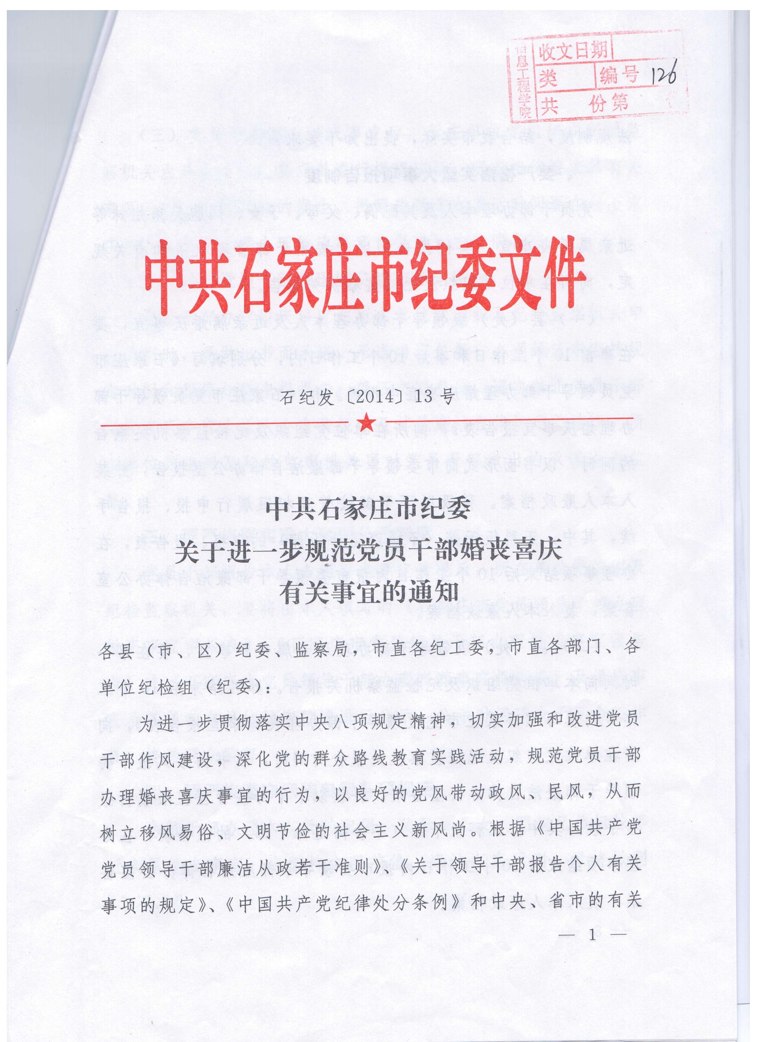 现将中共石家庄市纪委《关于进一步规范党员干部婚丧喜庆有关事宜的通知》转发给你们,迅速组织本部门所有人员认真学习,贯彻落实,严格遵守。