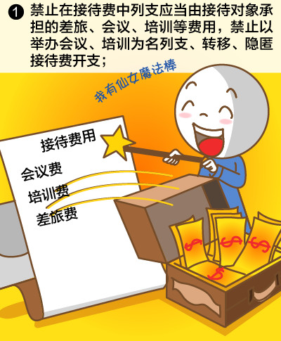 禁止在接待费中列支应当由接待对象承担的差旅、会议、培训等费用,禁止以举办会议、培训为名列支、转移、隐匿接待费开支;禁止向下级单位及其他单位、企业、个人转嫁接待费用,禁止在非税收入中坐支接待费用;禁止借公务接待名义列支其他支出。