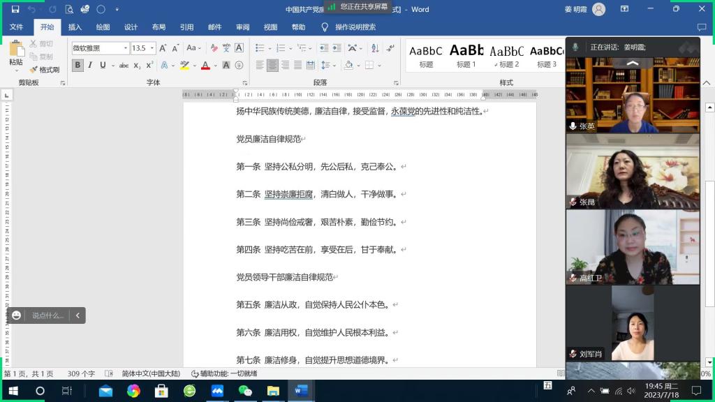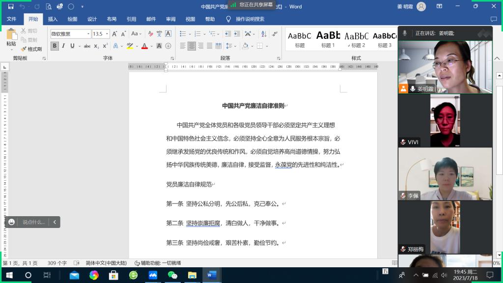 为贯彻落实“党风廉政建设”专题活动,7月18日,会计系教师第一党支部书记姜明霞带领全体党员认真研读学习了《中国共产党章程》、《中国共产党纪律处分条例》、《中国共产党廉洁自律准则》。