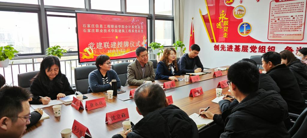 田静与石若峰互授“党建联建”牌匾。随后,一行人集体参观了会计系的实训室、党员活动室、和思政园地,会计系相关负责人、石家庄职业技术学院建筑工程系相关人员参加了活动。
