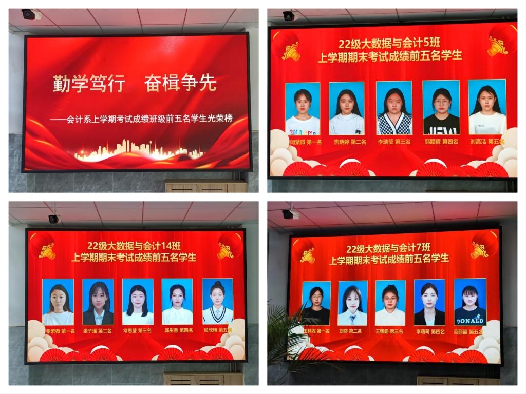 12月份,临近期末考试,为了响应会计系学风、考风活动月建设,以学风促考风,宣传展示了上学期期末考试成绩班级前五名学生,号召全体学生以他们为榜样,对标先进,全力以赴,积极备战期末考试,形成比学赶超、奋勇争先的学习氛围,激发出自己最大的潜力,考出自己最优秀的成绩。
