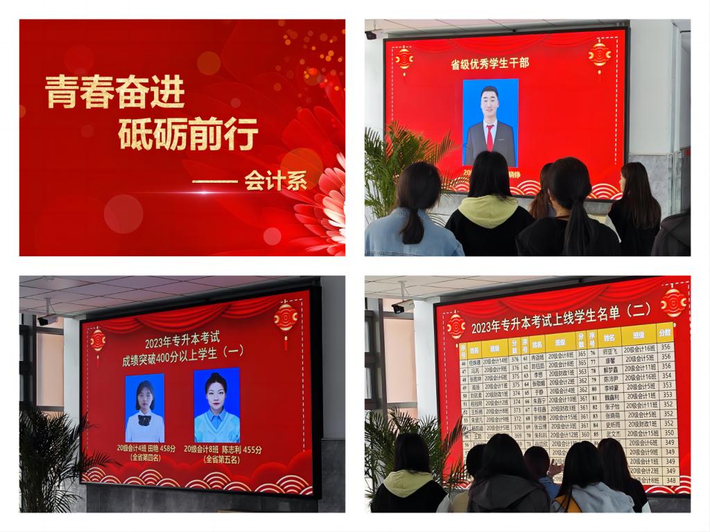 10月份,宣传展示了2023年度获得省市优秀学生荣誉称号、省市专业技能大赛中获奖学生、专升本学生、取得助理会计师资格学生。 激励全体学生努力拼搏、勇于挑战、刻苦学习,涵养进取品格,以奋斗姿态激扬青春,不负时代,不负华年。