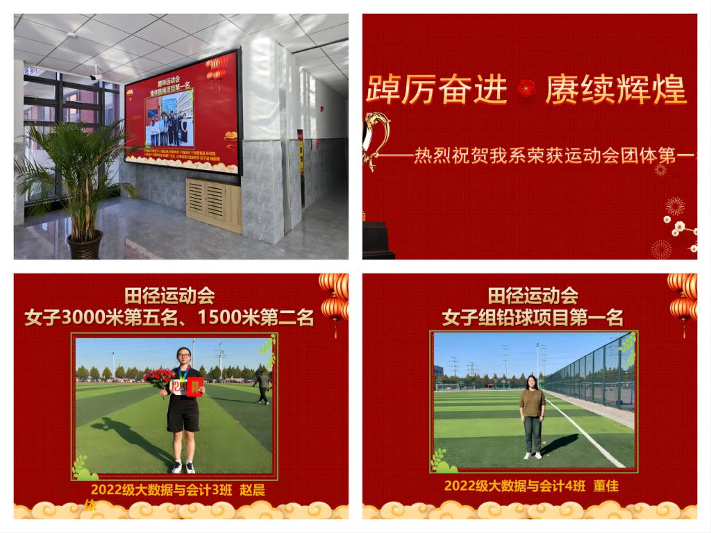 11月份,会计系在刚刚结束的学院运动会中取得了团体第一名的好成绩,为了发扬奋斗、拼搏、坚持和团队合作的体育精神,对运动会中全体运动健儿风采进行宣传展示,激励全体同学在今后的学习工作中要积极面对挑战,勇于克服困难,努力学好知识,不断增长才干,勇于拼搏、锐意创新、发奋成才!