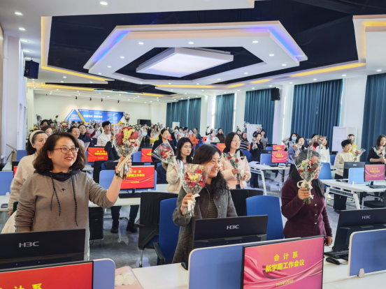 在全系大会的现场,工作人员向每一位女教师献上了一束精美的鲜花。这些鲜花不仅表达了对女性教师身份的尊重,更是对她们深深的谢意和祝福。老师们脸上洋溢着幸福的笑容,深切感受到了来自会计系大家庭的温暖与关怀。鲜花的芬芳与女老师们温馨的笑容相互映衬,为整个会场增添了一抹温馨而和谐的色彩,营造出一种浓厚的节日氛围。