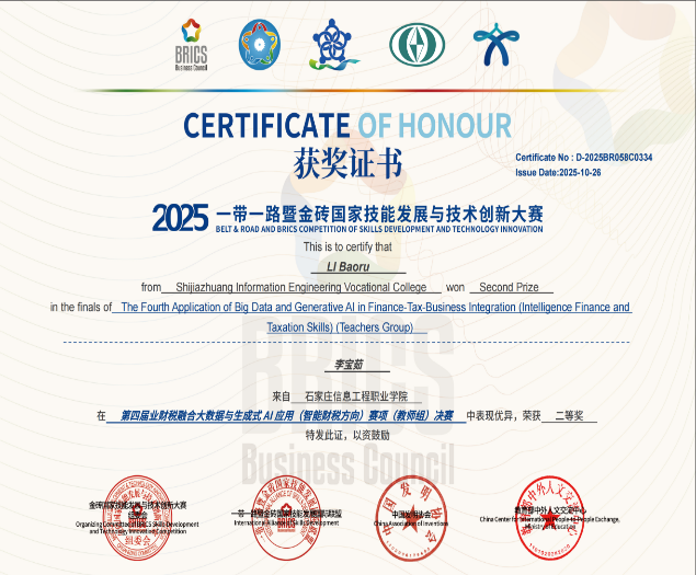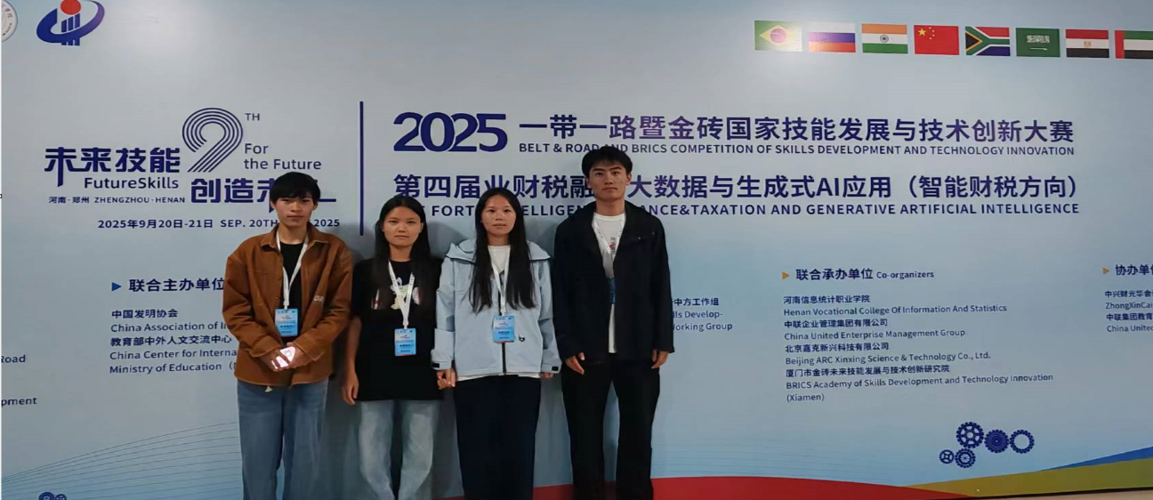近期,2025一带一路暨金砖国家技能发展与技术创新大赛第四届业财税融合大数据与生成式AI应用赛项决赛在河南信息统计职业学院举行,本届赛事吸引了全国80多所院校的精英队伍同台竞技,我院会计系教师李宝茹、学生李泓庆、郑云吉、李佳琪、门倩凭借卓越表现分别荣获教师组二等奖、学生组二等奖。