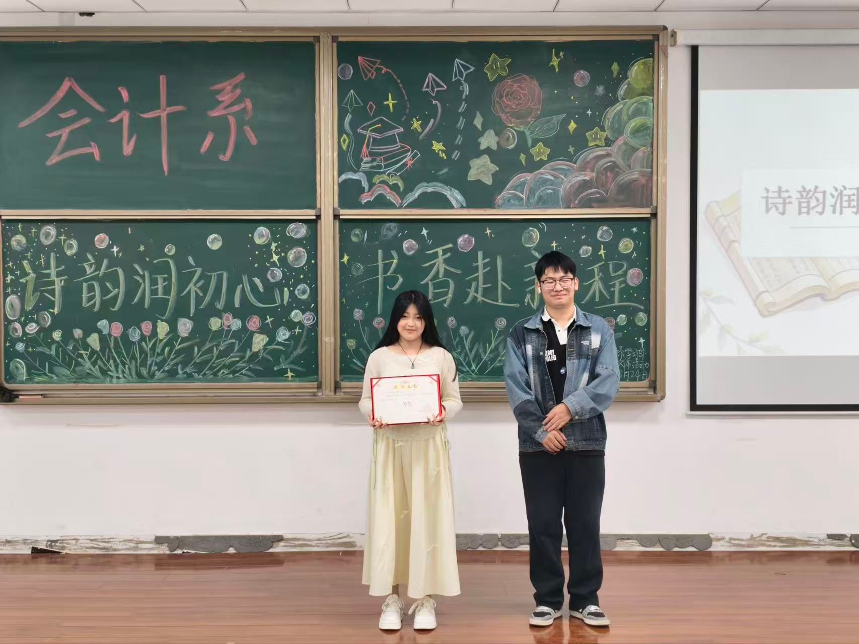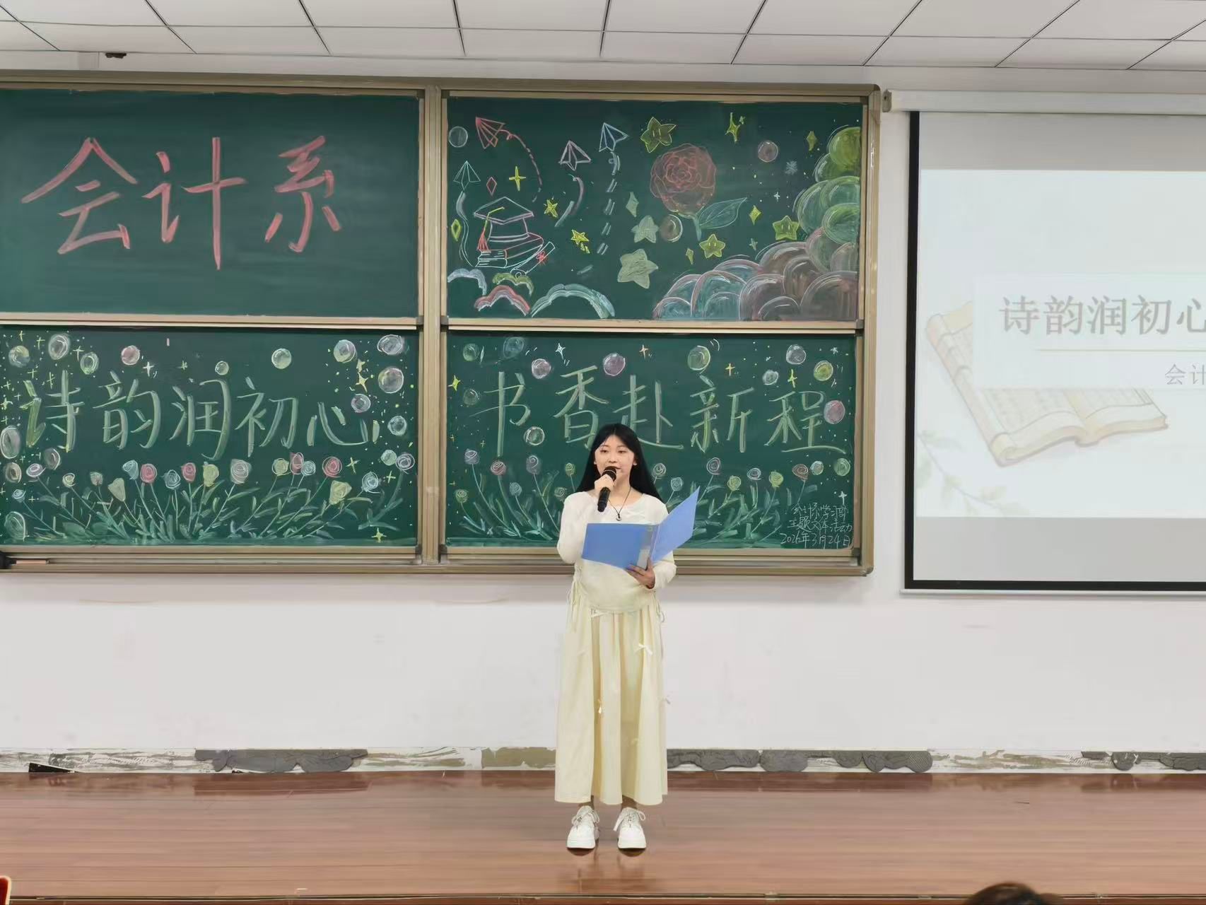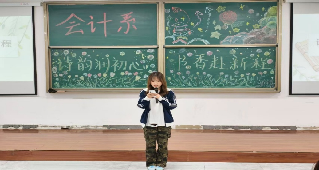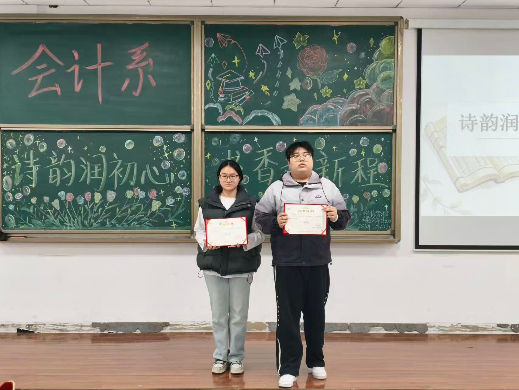 为深入推进中华优秀传统文化传承发展工程,厚植青年文化自信与家国情怀,引导同学们挖掘经典时代价值、涵养文明素养、丰富校园文化生活。会计系学生会学习部于3月24号在知新2-4连廊210教室举办“诗韵润初心,书香赴新程”诗歌朗诵比赛。以声传情、以诵明志,用经典诵读弘扬中华优秀传统文化,用书香雅韵丰富师生精神文化生活。