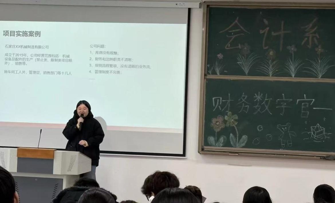 为助力学生精准把握会计行业数智化转型方向,科学规划职业发展,深化会计系校企协同路径,创新人才培养模式,2025年12月12日,由会计系会计信息管理教研室、会计信息化社团联合河北云匙科技有限公司共同主办的“财务数字官-企业数字化转型核心力量”专题讲座,在知新2-4号楼连廊210教室成功举办。河北云匙科技有限公司项目经理魏增颂、实施顾问曹欣妍、运维工程师刘微,会计系书记田静、主任姜明霞、会计信息管理教研室主任刘轶卿及会计系师生代表共同参与了本次活动。
