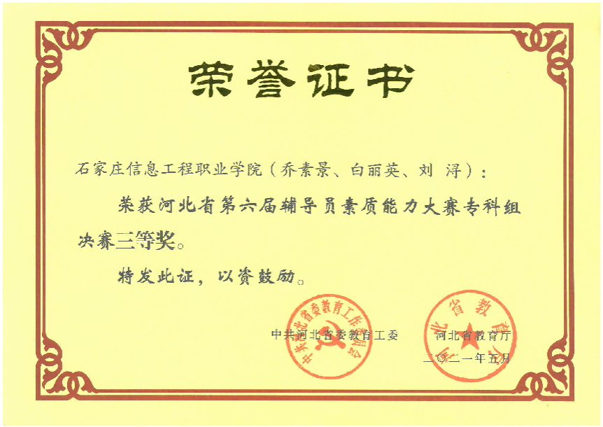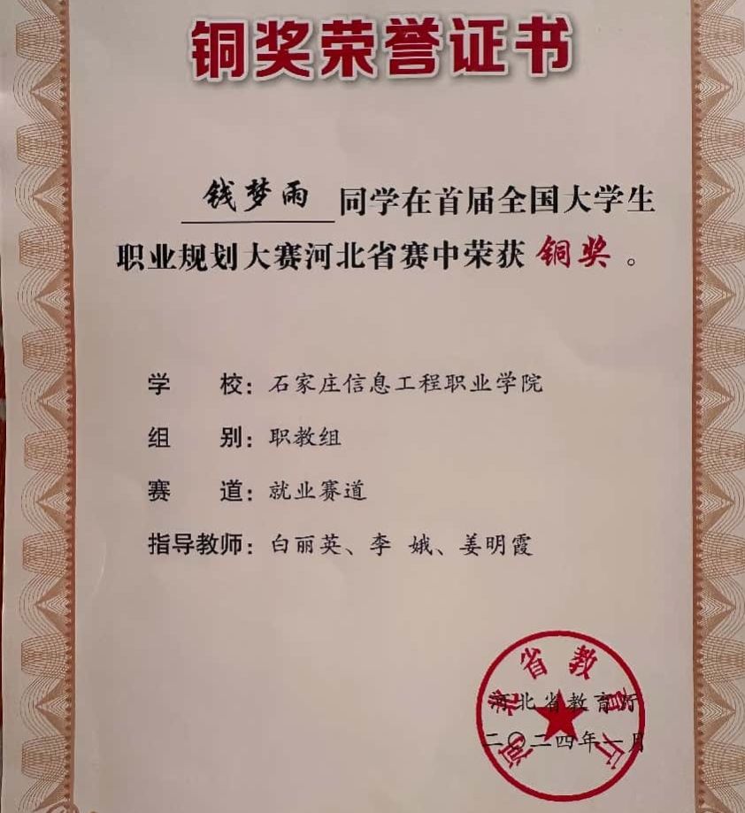 立足高职办学定位和学生特点,积极探索“精准化、全程化、专业化”的就业指导路径。在学生职业认知启蒙、职业定位引导、求职能力提升和就业心理疏导等方面形成了较为成熟的工作模式,注重通过职业测评、分类指导、家校协同和校企联动,帮助学生树立正确的就业观、成才观,提升就业竞争力和岗位适应能力,推动学生实现更高质量、更充分就业,连续两年指导学生参加全国大学生职业规划大赛获得河北省铜奖。