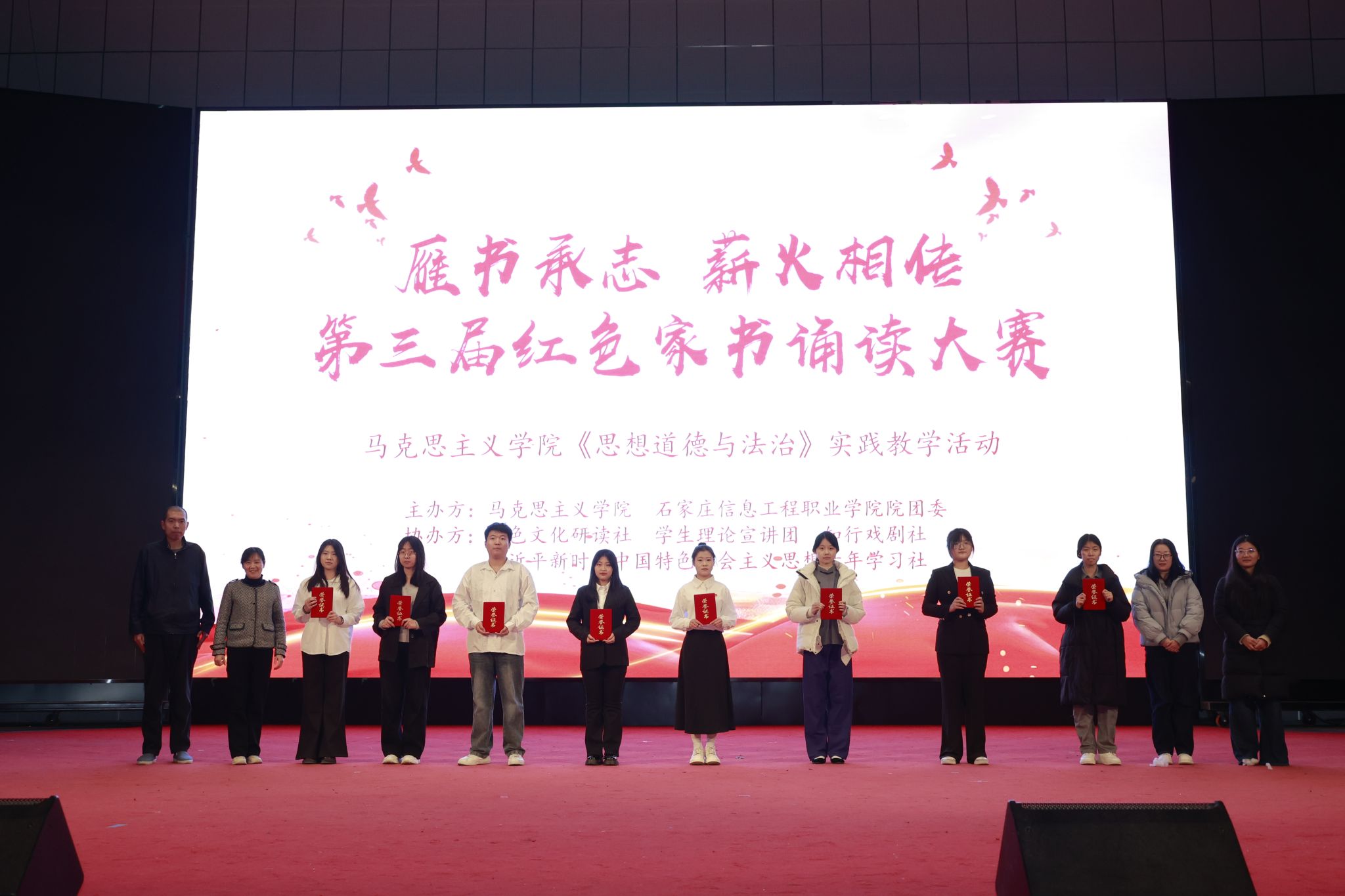 1月5日,学院第三届“雁书承志薪火相传”红色家书诵读比赛总决赛在昭德礼堂举行。本次比赛由马克思主义学院牵头,联合学生处(团委)共同主办,学院理论社团红色文化研读社具体承办,旨在以红色家书为纽带,引导青年学子重温革命历史,传承红色基因。