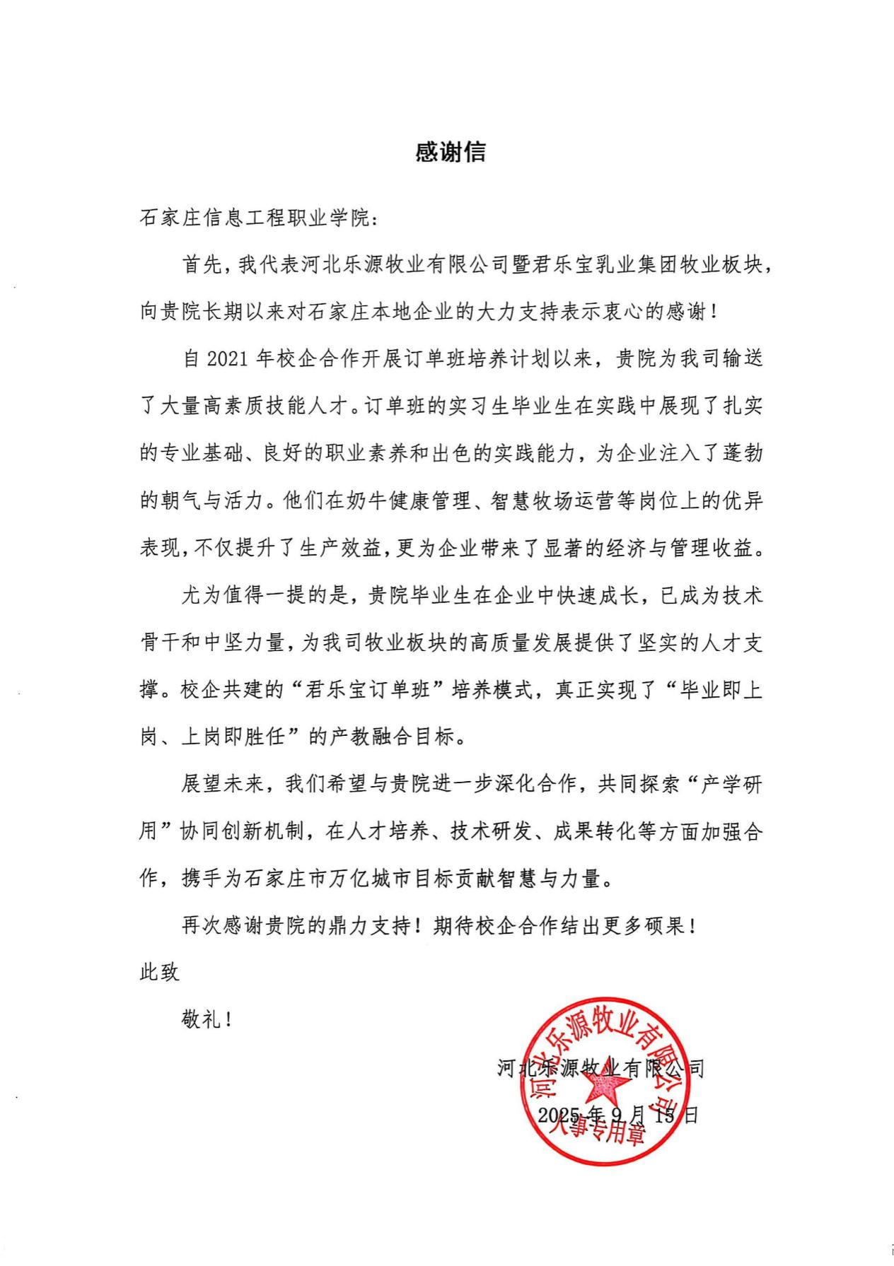 近日,我院收到河北乐源牧业有限公司(君乐宝乳业集团牧业板块)发来的感谢信,信中充分肯定了校企合作订单班的人才培养质量,并对学校长期以来对本地企业的支持表示衷心感谢。