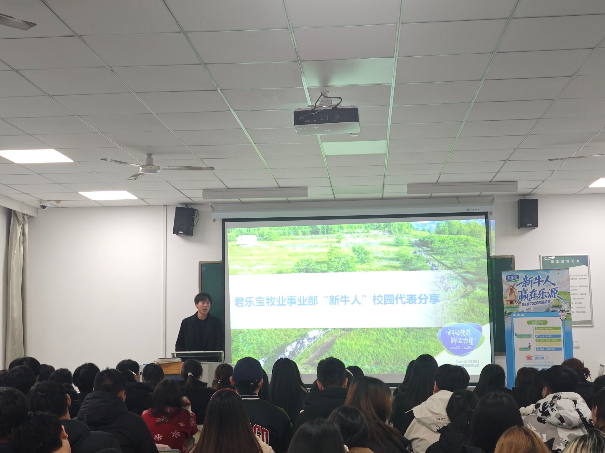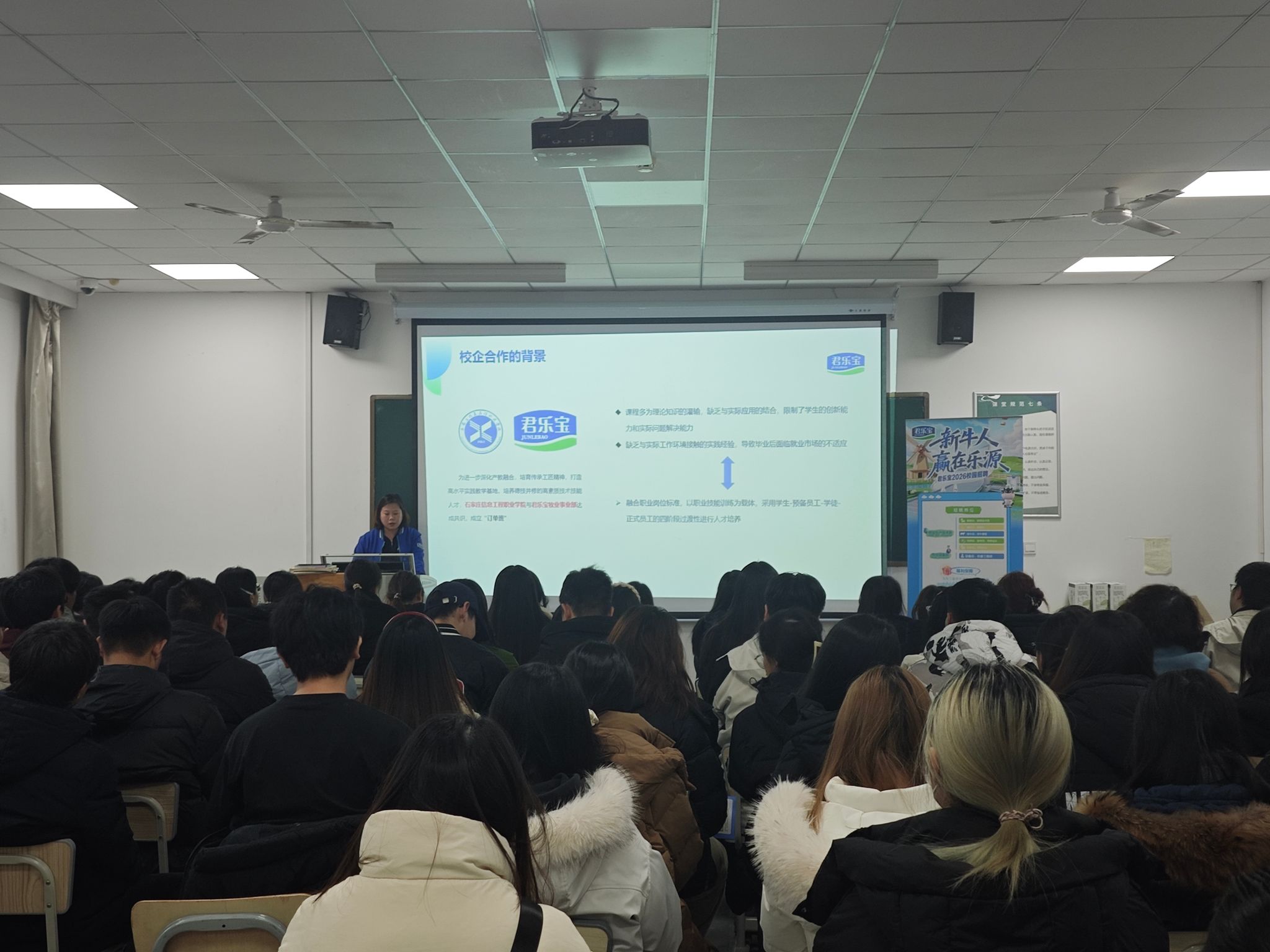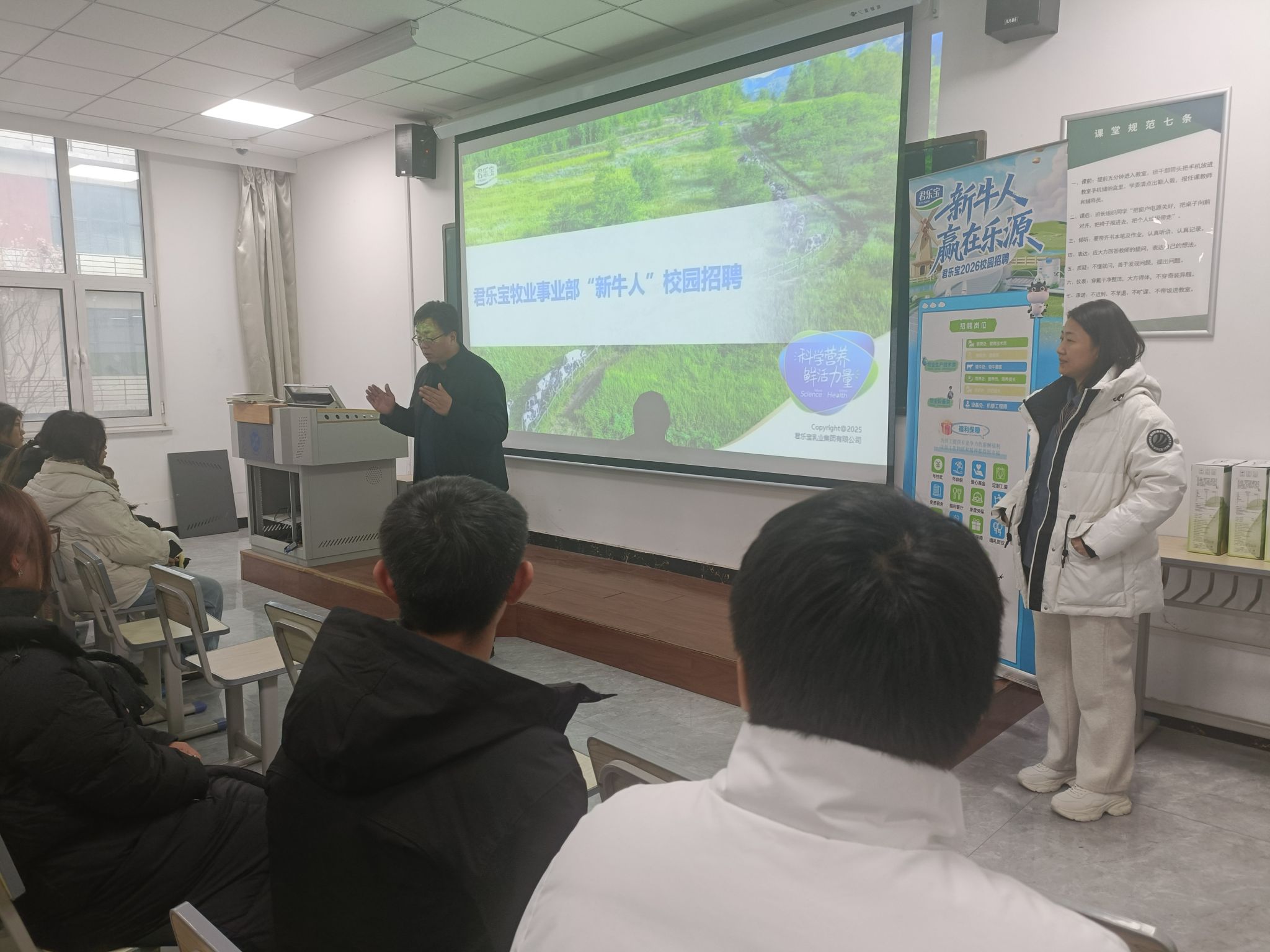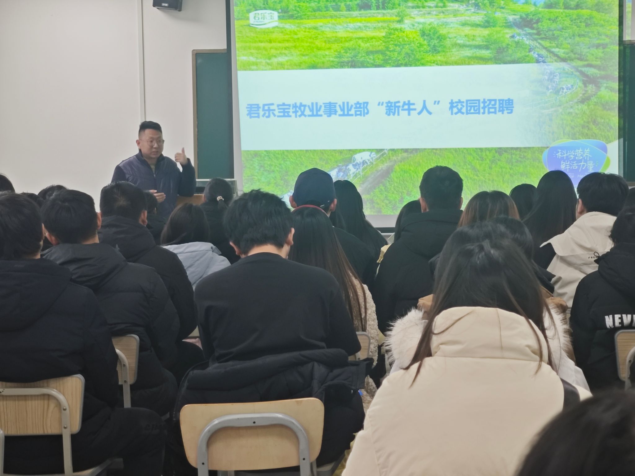 为深化校企合作,助力学子明晰职业方向,提升就业竞争力。12月18日,农林牧医系特邀河北乐源牧业赵华为经理代表一行莅临我系,开展“新牛人”校园招聘宣讲会。系党总支书记宋建蓬、畜牧兽医教研室主任龙霄出席活动,君乐宝牧业事业部招聘负责人赵华为、吕俊芬携现就职于企业的往届优秀毕业生代表共同参会,与全系百余名学子齐聚一堂,共话成长与发展。