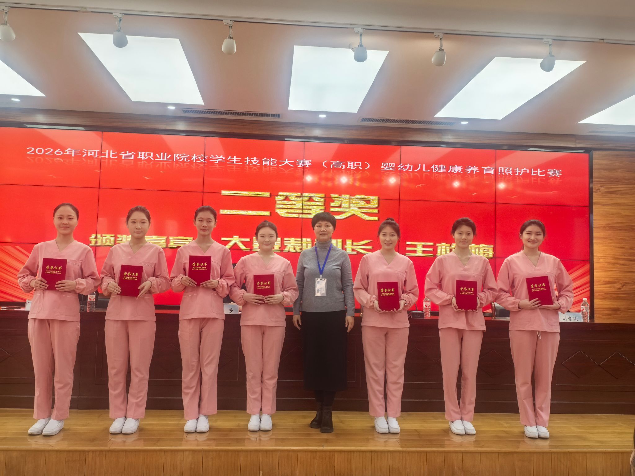 近日,由河北省教育厅主办,河北省卫生职业教育集团、河北女子职业技术学院承办的2026年河北省职业院校技能大赛(高职)婴幼儿健康养育照护比赛成功举办。来自全省11所高职院校的参赛队伍同台竞技,我院生物医药技术系婴幼儿托育服务与管理专业张子涵、黄亚美、段希媛三名同学组成的参赛团队,在刘旭、栗慧萍老师的指导下,顽强拼搏,斩获大赛二等奖。