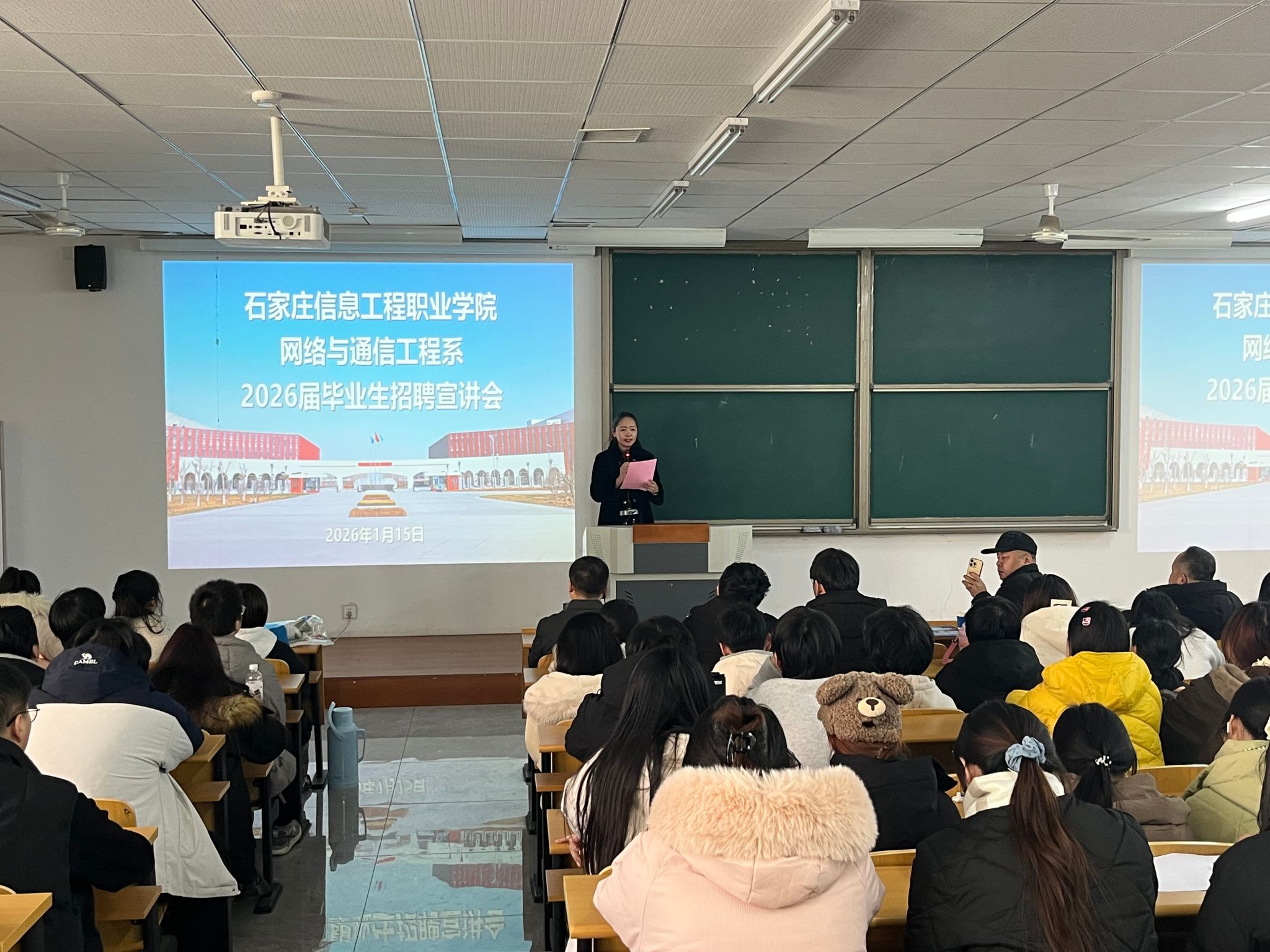 为搭建校企人才精准对接桥梁,助力2026届毕业生实现高质量就业,2026年1月15日,网络与通信工程系精心筹备的毕业生招聘宣讲会在知行4号楼143、249、347 教室及知海1号楼228多媒体教室同步举行。系党总支书记王丽萍、各教研室主任、专任教师及毕业班辅导员同全系667名毕业生齐聚现场,与6家行业优质企业代表共赴这场“就业之约”。