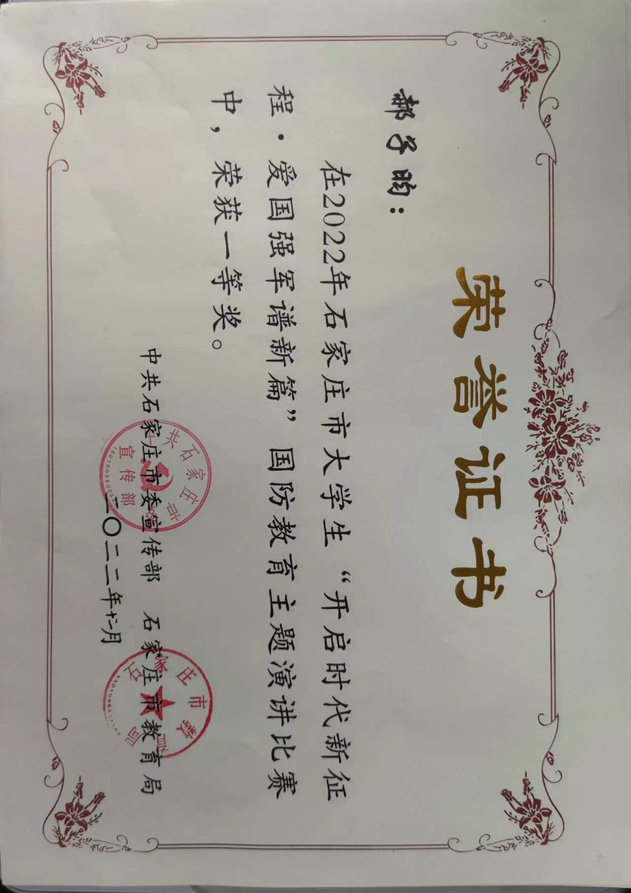 2022年10月,石家庄市委宣传部、石家庄市委教育局在全市高校范围内开展了“复兴强国有我”2022年石家庄市大学生“开启时代新征程·爱国强军谱新篇”国防教育主题演讲比赛,我院团委经过层层筛选,组织了四名学生参赛,最终参赛的四名同学全部荣获一等奖,张琰老师荣获“优秀辅导教师”。